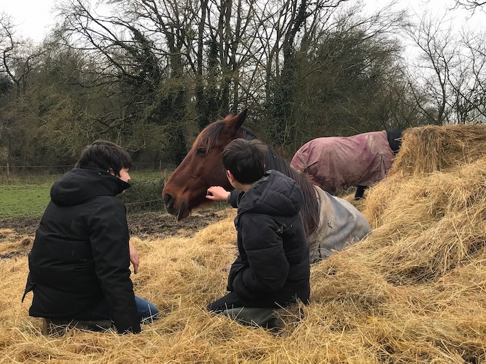 Pas d’équitation, nous restons à côté du cheval pour apprendre comment ils vivent naturellement, en prendre soin, se promener avec eux, prendre conscience de notre posture et notre communication, s’affirmer, prendre confiance en soi, et surtout passer un temps chouette tous ensemble !